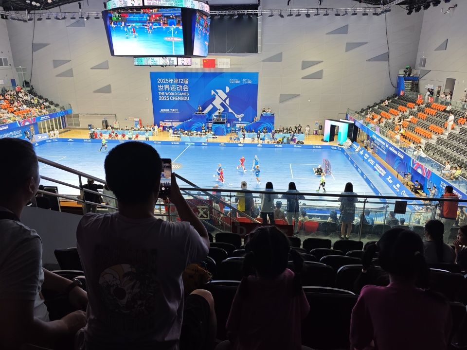 MK体育官方网站8月6日,成都世运会软式曲棍球项目比赛在新都香城体育中心举行。记者在现场看到,今日前来看比赛的观众热情高涨,不少人举着自制应援牌,每当场上出现精彩配合或进球,看台便会响起整齐的欢呼声。场馆内随处可见世运会吉祥物“蜀宝”“锦仔”的身影,电子屏循环播放着赛事宣传片,浓厚的赛事氛围感染着每一位到场者。